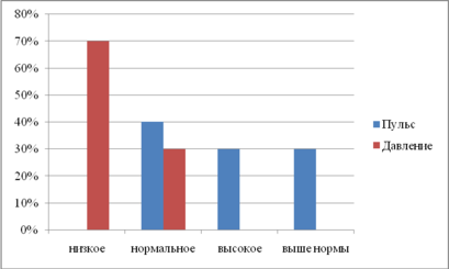 Как мы видим на рис. 5-6, 40 % испытуемых имеют пульс в норме, 30 % - высокий, 30 % - выше нормы. Давление этих же испытуемых следующее: 70 % - низкое, 30 % - норма, 0 % - высокое.