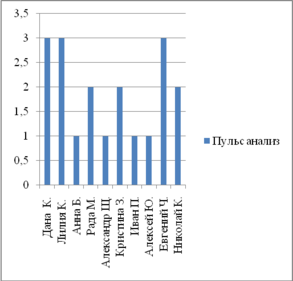 Результаты, свидетельствуют о том, что деятельность сердечно-сосудистой системы может изменяться в зависимости от природных факторов. Пульс у некоторых учащихся повышается, у некоторых снижается, что свидетельствует о том, что появляется усталость.