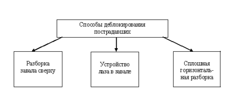 Пострадавшие, находящиеся под обломками строительных конструкций, в зависимости от структуры завала, глубины их нахождения, а также от возможностей имеющихся технических спасательных средств, деблокируются следующими способами (рисунок 4.5).