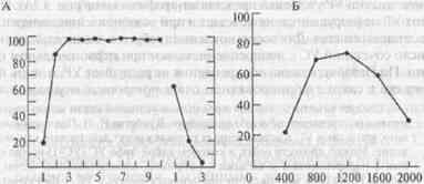 Безусловный стимул — струя воздуха, направленная на роговицу; условный — звук; А — его угашение; Б — генерализация ответа при использовании в качестве УС тонов разных частот. По оси ординат — доля УР (в %), по оси абсцисс — число предъявлений (А) и частота тона (Б).