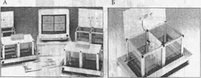А — современная установка для изучения условной реакции активного избегания, которая обычно состоит из 4 челночных камер с автоматизированным управлением и выводом результатов на экран монитора; Б — отдельная челночная камера.
