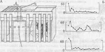 А — один из вариантов «проблемного ящика», предложенный Э. Торндайком для исследования способности животного к решению.задачи методом «проб и ошибок»; Б — примеры кривых научения при использовании этого метода. По оси ординат — время, затраченное на решение задачи, по оси абсцисс — последовательные предъявления теста.