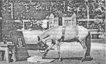 Рис. 8. Инструментальные условные рефлексы у дрессированной лошади «умного Ганса». На фотографии видно, как ударами копыта по специальной доске Ганс сигнализировал «правильный» ответ (по Н. Н. Ладыгиной-Котс, 1914).
