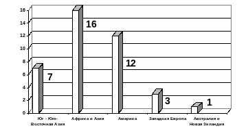 Основное происхождение декоративных растений, представленных на цветочном рынке города Самары - Африка и Азия, чуть меньше – влажные тропики Америка (см. рис. 3.2.1.)