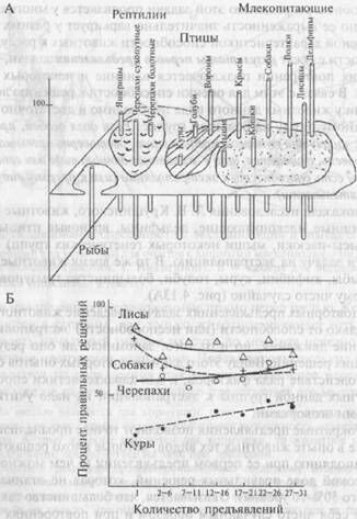 А — успешность решения задачи на экстраполяцию животными разных таксономических групп при ее первом предъявлении; по оси ординат — доля правильных решений в процентах (плоскость соответствует 50%-му случайному уровню правильных решений); Б — усредненные кривые успеха решения задачи при ее многократных предъявлениях животными разных таксономических групп (по Крушинскому, 1986). По оси ординат — как в случае А, по оси абсцисс — номера предъявлений.