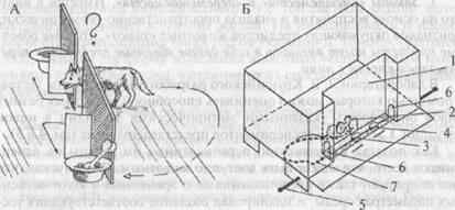 Опыты с грызунами проводятся несколько по-другому. Вторую кормушку тоже наполняют кормом (поилки с молоком). Эту кормушку либо закрывают сеткой (в опытах с крысами), либо (опыты с мышами) ставят так, чтобы животное ее не видело. Это позволяет «уравнять запахи», идущие от приманки с двух сторон камеры, и тем самым препятствовать отысканию корма с помощью обоняния. Экспериментальная камера для исследования способности к экстраполяции у мышей (рис. 12Б) устроена так, чтобы животное оставалось в ней в интерватах между предъявлениями задачи. В одной из стенок камеры (1) на середине ее длины на уровне пола имеется отверстие (2), дающее животному доступ к поилке (3) и позволяющее видеть начальный этап ее перемещения. Контрольная поилка (4) перемещается в противоположную сторону. С помощью специального рычага (5) их можно передвинуть к боковым отверстиям (6). «Обход ширмы» в этом варианте установки — это перемещение животного вправо или влево и подход к одному из боковых отверстий. Траектория (7) показывает путь мыши при правильном решении задачи.