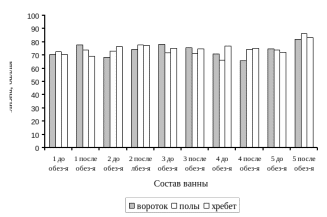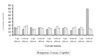 Диаграммы зависимости содержания жировых веществ в кожевой ткани и волосяном покрове по топографическим участкам от состава ванны представлены на рисунках 8, 9.
