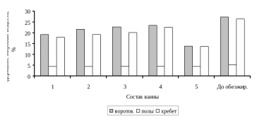 | Состав ванны | Топографический участок шкуры | Содержание жировых веществ в кожевой ткани, % | Содержание жировых веществ в волосяном покрове, % | ||||