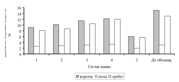 Типовая и предложенная методики показали снижение содержания жировых веществ в пределах ГОСТ (10-20% для кожевой ткани и 2% для волосяного покрова). По типовой методике после проведения процесса обезжиривания содержание жировых веществ в кожевой ткани уменьшилось в среднем на 46%, в волосяном покрове на 56%, а при использовании состава ванны 1 в отсутствии СПАВ в кожевой ткани уменьшилось количество жировых веществ на 29% и в волосяном покрове на 36%.