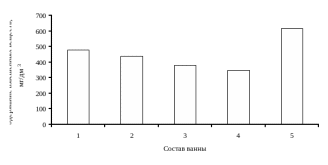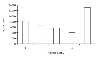 Анализируя данные, представленные в таблице 11 и на рисунках 12, 13 можно отметить, что пробы сточной воды ванн 1(100% расход бактериальной суспензии от объема рабочей ванны) и 5 (типовая методика) характеризуются максимальным содержанием взвешенных веществ 480 мг/дм3 и 616 мг/дм3 соответственно и максимальным химическим потреблением кислорода 8200 мгО2/дм3 и 13120 мгО2/дм3 соответственно. При рассмотрении динамики изменения содержания взвешенных веществ и химического потребления кислорода у проб сточной воды ванн 1-4, содержащих бактериальную суспензию с разными концентрациями видно, что происходит уменьшение данных показателей с уменьшением концентрации бактериальной суспензии. Снижение показаний ХПК связано с микробной деструкцией органических веществ в исследуемых сточных водах, а увеличение содержания взвешенных веществ в пробах сточной воды указывает на максимальное удаление минеральных примесей.