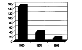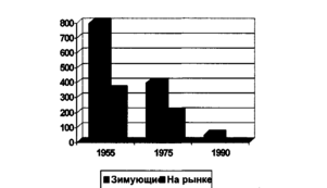 Рис. 10. Оценка численности зимующих гусей и размер добычи охотниками в Китае в 1955-1990 гг. (Андреев, 1990г.).