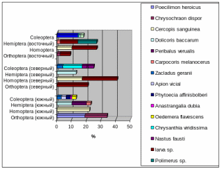 При общем анализе данных по сравнению насекомых, выявлено количество общих видов для всех фаций водораздельного экотона только для семейства Cercopidae – вид Cercopis sanguinea. Общими для северной и южной экспозиций является вид Dolicoris baccarum cемейства Pentatomidae и вид Zacladus geranii семейства Curculionidae. Вид Carpocoris melanocerus cемейства Pentatomidae и вид Chrysochraon dispor семейства Acrididae характерны для южной и восточной экспозиций. А на склонах северной и восточной экспозиций встречаются насекомые отряда Homopteta и отряда Orthoptera, но только на личиночной стадии развития. Все выше перечисленные виды встречаются только на одной определенной фации и больше не дублируются. Такое закономерное распределение видового набора хортобионтов доказывает прямую взаимосвязь микроклимата, растительных ассоциаций и хортобионтов.