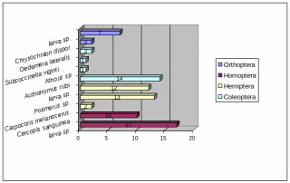 Была рассмотрена структура отрядов хортобионтов, присущих склоновому экотону хребта Абишира-Ахуба (рис. 24). Доминирует отряд Homoptera – 60%, как на ледниковом экотоне. Перевес этого отряда над следующим – отрядом Hemiptera составляет более 30%. Насекомые отряда Coleoptera составляют 11% от общего состава хортобионотов хребта Абишира-Ахуба. Самым малочисленным, как и на всех представленных видах экотона, явился отряд – Orthoptera – всего 3% от всех беспозвоночных.