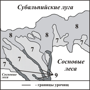 8 – древних каров, сложенных коллювием, с субальпийскими лугами на горно-луговых почвах;