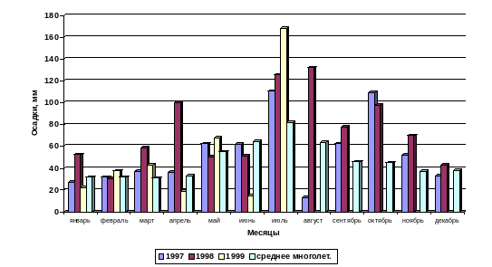 Рис. 2. Среднемесячное количество осадков (1997-1999 гг.), м