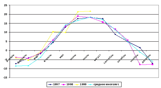 Рис. 1. Среднемесячная температура воздуха (1997-1999 гг.), ºС
