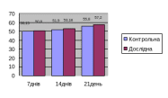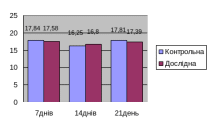 Показник ВГЕ (рис. 3.3.5) контрольної та дослідної груп за весь період дослідження майже не змінювався. На 7-й день у дослідної групи становив 17,58, на 14-й день -16,8, а на 21-й день - 17,39, а у тварин контрольної групи відповідно 17,84; 16,25; 17,81.
