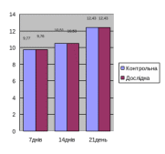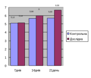 Кількість лейкоцитів за весь період дослідження в контрольній та дослідній групах поступово збільшувався (рис. 3.3.3) з 9,76 до 12,43 Г/л, що відповідає межам фізіологічної норми.