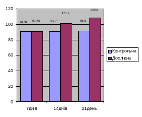 Вміст гемоглобіну (рис. 3.3.1) у крові поросят обох груп, на початку дослідження, був близько 90,68-90,46 г/л. Після введення препаратів на 14-й день у дослідній групі його вміст зріс до 101,4 г/л, будучи на 10,7 г/л більше ніж у контрольній, а на 21-й день 108,6 г/л в дослідній та 91,6 в контрольній, різниця становила 17,0 г/л. Підвищення показників вмісту гемоглобіну в дослідній групі ми пов’язуємо з впливом препарату ферровет на обмін речовин та краще засвоєння заліза.