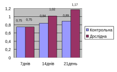 Показник КПК (рис. 3.3.4) у поросят дослідної групи почав підвищуватися на 14-й день дослідження і його показник становив 1,02. Він значно підвищився на 21-й день порівняно з контрольною групою на 0,28.