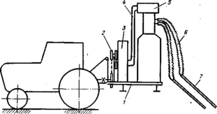 Схема 1. Общая схема сборщика семян ССМ-1: 1-рама; 2 -система привода; 3- вентилятор; 4- всасывающий воздуховод; 5-циклон; 6 - гибкий шланг; 7 — наконечники