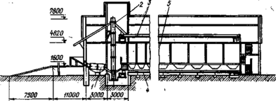 Схема 2. Амбар для шишек емкостью 100 т: 1 — барабан сортировочный; 2 — элеватор ковшовый; 3 — верхний ленточный транспортер; 4 — нижний желобчатый транспортер; 5—закром