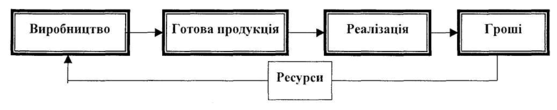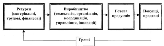 Процес виробництва полягає у споживанні ресурсів підприємства (матеріальних, трудових, енергетичних, фінансових, інформаційних) та їх трансформації у готову продукцію, виконані роботи чи послуги для задоволення потреб споживачів й отримання прибутку. Місце виробничого процесу в кругообороті засобів підприємства можна показати схематично (рис. 3.1).