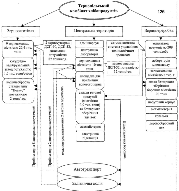 Загальна характеристика. ТОВ "Тернопільський комбінат хлібопродуктів" підпорядковане ДАК "Хліб України". Основними видами діяльності ДП "Тернопільський КХП" є борошномельна промисловість, заготівля. Загальна земельна площа, що є у користуванні Тернопільського КХП, становить 7,08 га. На даній території розміщені виробничі приміщення, зернові склади та асфальтні площадки для приймання зерна й відпуску готової продукції. Підприємство має три окремих підрозділи (рис. 3.3).
