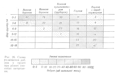 У річному плані з урахуванням реакції ґрунтового розчину і гранулометричного складу ґрунту, вологозабезпеченості та біологічних особливостей культур указуються кращі форми мінеральних добрив із тих, що закупило господарство під урожай майбутнього року (якщо таких даних немає, використовуються форми добрив, які були закуплені господарством під урожай поточного року) [37]. Рекомендована форма мінерального добрива вказується скорочено біля дози поживної речовини. Щоб визначити потребу в добривах для сівозмін за їх формами, доза поживної речовини перераховується на відповідну форму мінеральних добрив. При складанні плану внесення добрив для садів, луків та інших угідь необхідно вивчити місце знаходження цих угідь, ґрунти, вологозабезпеченість, для саду — склад порід і щільність насаджень, для луків — компоненти травостою, запланований урожай, удобрення цих угідь у попередні роки. Це дасть можливість правильно визначити види добрив і способи їх внесення. Після складання плану внесення добрив на 1 га, визначають потребу в них для сівозмін і угідь господарства. Важливим питанням є обґрунтування річного плану внесення добрив. У ньому вказують, що враховували при складанні плану внесення добрив, закупки та асортимент мінеральних добрив, які брали за основу тощо. Аргументують місце проведення хімічної меліорації та норму меліоранту. Теоретично доводять рекомендовані форми мінеральних добрив під культури: фосфорні — залежно від реакції ґрунтового розчину і способу внесення; азотні — з урахуванням гранулометричного складу ґрунту, вологозабезпеченості; калійні та мікродобрива — з урахуванням особливостей живлення культур та інших факторів. Є два способи внесення добрив у грунт: суцільне (врозкид) і місцеве (локальне). При суцільному внесенні добрива рівномірно розподіляють (туковими сівалками, гноєрозкидачами тощо) по поверхні грунту, а потім загортають у грунт. Застосовуючи для загортання добрив різні ґрунтообробні машини, можна досягти різної глибини загортання добрив у грунт, різного ступеня перемішування добрив з ним і різного характеру розміщення добрив у грунті (рис. 3.1).