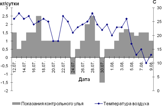 Данные 2008 года полностью подтверждаются полученными результатами 2009 года. Коэффициент корреляции между показаниями контрольного улья и дневной температурой воздуха составил 0,2. Главный медосбор наступил во второй половине июля и продолжался до 29 июля. В данный период только 24 июля были отрицательные показания контрольного улья, что было вызвано снижением температуры воздуха и влажности до 49%, а также влиянием сильного порывистого ветра северного направления. В начале августа медосбор вновь возобновился с началом цветения фацелии пижмолистной, медосбор с которой продолжался до 9 августа и прекратился с вязи с понижением температуры воздуха до 5…7 ºС и выпадением осадков в виде дождя.