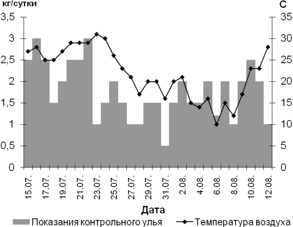 Основным фактором, влияющим на сбор нектара пчелами, является температура окружающего воздуха, так как от неё зависит выделение нектара растениями и летная деятельность медоносных пчел. Условия медосбора в период исследований изучали по показаниям контрольного улья.