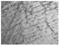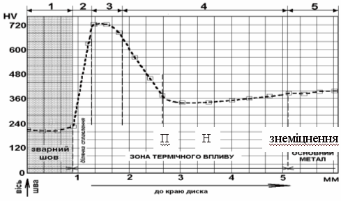 Зона термічного впливу складається із трьох ділянок - перегріву (П), нормалізації (Н) та відпуску (знеміцнення). В ділянці перегріву структура повністю мартенситна (рис.4.2б) з твердістю HV655. .740 (табл.4.3), а в ділянці нормалізації - троостито-мартенситна з твердістю HV450. .500 (рис.4.3, а). Між основним металом диска із трооститною структурою твердістю HV385. .400 (рис.4.3б) 8 праворуч, та зварним швом ліворуч, в ЗТВ знаходиться ділянка