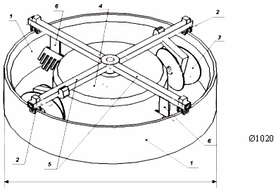Рис.3.12 Схема установки для стендових випробовувань відновлених дисків: 1 - корпус, 2 - опорні ролики, 3 - сошники зернової сівалки, 4 - колона, 5 - хрестовина, 6 - ущільнювач ґрунтової маси