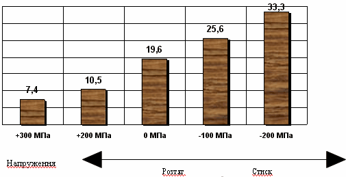 Рис.4.9 Залежність зносостійкості термічно-обробленої сталі 65Г від величини та характеру робочих напружень