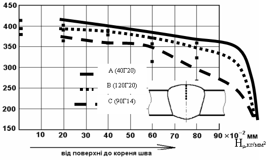 Із віддаленням від поверхні шва, по його поперечному перерізу, твердість знижується (рис.4.6). Результатами вимірювання мікротвердості по поперечному перерізу шва в місці зміцненої поверхні встановлено, що зміцнення металу до HV365. .418 для всіх швів сягає на глибину 0,5. .0,57мм. З віддаленням від поверхні твердість поступово знижується і вже на віддалі 0,95. .1,2мм. вона дорівнює початковій твердості різних за хімічним складом досліджених металів зварних швів.