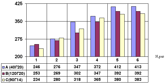 | В (120Г20) | 0,8-0,85 | 11-11,5 | 194.201 | 402. .407 | 110. .116 |
