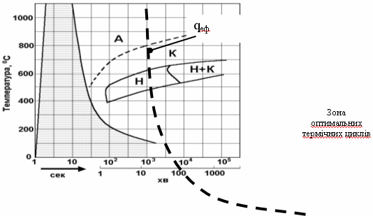 Рис.2.4 Термокінетична діаграма висомарганцевистої сталі (0,8. .0,9%С, 10. .13%Mn) із зоною оптимальних термічних циклів, А-аустеніт, К - карбід, Н-голкоподібний карбід, П-перліт, qеф -ефективна потужність зварювальної дуги,