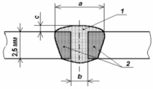 Рис.2.3 Геометричні параметри та склад зварного з’єднання із частками основного та присадного матеріалів: а-ширина шва, b-ширина щілини між деталями, с-висота підсилення шва; 1-присадний матеріал, 2-основний метал