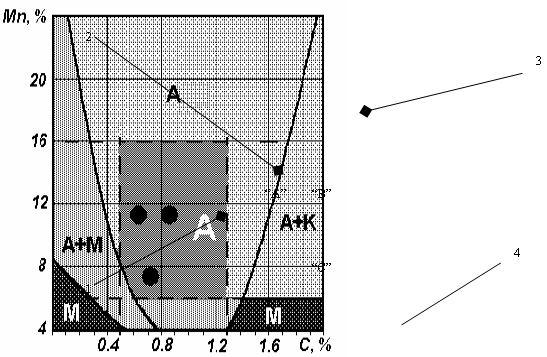На підставі аналізу структурної діаграми системи Fe-С-Mn встановлено, що при вмісті у сплаві вуглецю в межах 0,5. .1,3% та марганцю 6. .15%, при швидкостях охолодження Wох=15. .20 0С/с у діапазоні температур 500. .6000С можна отримати високомарганцевистий метал зварного шва з аустенітною структурою [109] (рис.2.2). При цьому необхідно приділити увагу забезпеченню високих швидкостей охолодження з метою одержання сплаву високого запасу аустенітності [136,138]. Вибір хімічного складу високомарганцевистого металу шва виконано із використанням структурної діаграми (рис.2.2), на якій можна виділити такі характерні ділянки: