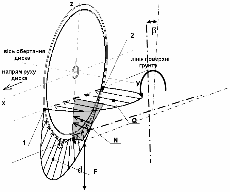 Рис.2.5 Силова схема дії робочого навантаження на диск сошника:α=200, β=250 - кути атаки відповідно у фронтальній і вертикальній площинах, F, N, Q - зусилля, які діють на диск під час руху у ґрунті