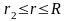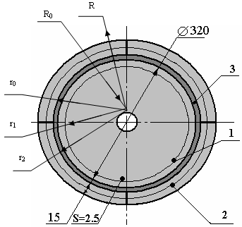 Рис.2.7 Геометричні розміри диска 1 -базова деталь, 2 - сектор ремонтного кільця, 3 - коловий зварний шов r0 - вісь зварного шва, r1, r2 - межі зони пластичних деформацій, R, R0 - зовнішній та внутрішній радіуси диска відповідно