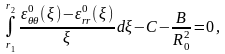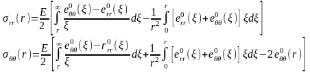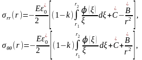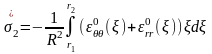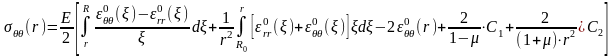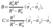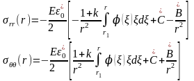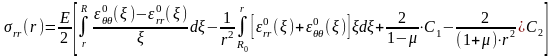 Відповідно підставивши цей вираз у співвідношення (2.5) та виконавши відповідні математичні перетворення, отримано вирази для розрахунку залишкових напружень у будь-якій точці тонколистової дискової деталі із технологічним отвором радіусом R0 та обмеженим радіусом R.