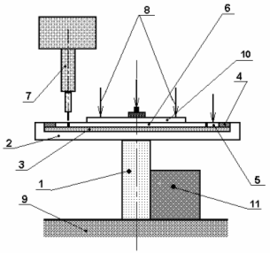 Рис.3.2 Технологічний зварювальний комплекс для позиціювання, фіксації та з'єднання базової деталі та секторів: а - зовнішній вигляд, б – схема: 1- колона, 2- робочий стіл, 3- мідна підкладка, 4- вивідна технологічна вставка, 5- сектори відновлювального кільця, 6- центральний диск, 7- зварювальна головка, 8- притискачі, 9 - основа, 10 - диск, 11 - двигун-редуктор