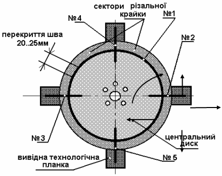 При стиковому зварюванні є висока ймовірність утворення дефектів в кінцевій частині шва 91,117. Це можуть бути пори, тріщини, підрізи, кратери 109. Для уникнення таких дефектів, використовуються технологічні планки 4 (рис.3.3), які дають змогу “вивести” місце утворення кратера за межі диска (рис.3.3). Ці планки виготовляються із зношених дисків і після зварювання та охолодження їх усувають.