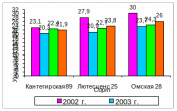 В 2003 г. прогнозируемая урожайность на 3,6 ц/га больше фактической (наиболее близка к прогнозу урожайность сорта Омская 28), и оправдываемость прогноза составила 83%. Это можно объяснить тем, что при прогнозе урожайности учитывается количество выпавших осадков, но не учитывается их распределение в течение вегетационного периода.