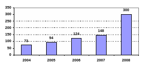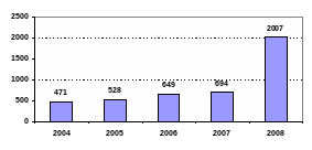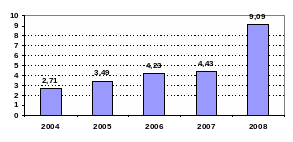 Анализ рис.3 показывает, что за последние 5 лет затраты на содержание основных средств увеличиваются постоянно, их значение за 2009 год превышает показатель 2004 года в 1,75 раза (832 / 470 = 1,75).