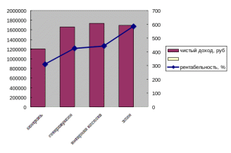 Условный чистый доход, на варианте с янтарной кислотой, составил 1737491,8 руб., что на 534800 руб. выше контроля. Наивысший уровень рентабельности был достигнут при обработке одревесневших черенков эпином, он составил 583 %, что на 273 % выше контроля.