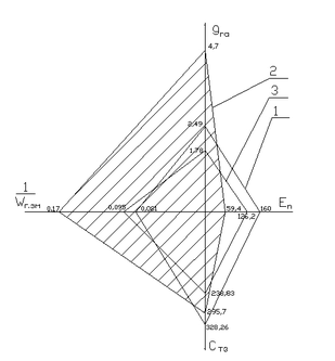 Для наочності процесу вибору застосовуємо графічний метод. Для цього відкладаємо на радіально розташованих шкалах значення критеріїв. Шкали будуємо таким чином, щоб покрашення критерію йшло до центру, з’єднуючи точки на шкалах для і-того варіанта, отримуємо багатокутник кращого варіанту.