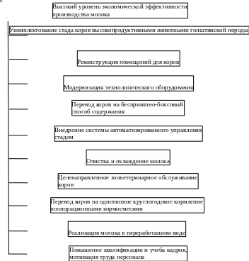 Разработанные меры разделены на три блока: 1) меры по повышению экономической эффективности производства молока; 2) меры по повышению экономической эффективности выращивания и откорма молодняка КРС; 3) меры по повышению экономической эффективности выращивания и откорма свиней [6, 7, 8]. Из схемы на рисунке 6 видно, что обследованному предприятию в целях повышения экономической эффективности молочного скотоводства рекомендуется осуществить ряд организационно-технологических и организационно-экономических мероприятий. При этом следует отметить, что немалую часть указанных мероприятий руководство предприятия уже осуществлет. К ним можно отнести укомплектование стада коров высокопродуктивными животными голштинской породы. Эта порода считается не только наиболее продуктивной, но и наиболее приспосабливающейся к разным внешним условиям. Выше уже отмечалось, что ОАО "За мир и труд" намечает закупки коров новой голштинской породы, потенциал продуктивности которой превышает 7500 кг молока в год. В хозяйстве взяли ориентир на обеспечение среднегодовой продуктивности коров на уровне, превышающем 7500 кг молока. В начале 2007 г. в ОАО "За мир и труд" поступили первые 150 нетелей голштинской породы, закупленные по лизингу у одной из компаний, поставляющих племенной скот. В конце года должно поступить еще 300 животных. Их матери, судя по зоотехническим документам, имеют годовую продуктивность в пределах 8000 кг молока. Хозяйство получило долгосрочный кредит на приобретение 500 нетелей голштинской породы. В целом на молочной ферме ОАО "За мир и труд" среднегодовое поголовье коров целесообразно довести до 1500 животных, в том числе за счет собственного воспроизводства стада. В 2006 г. число коров в хозяйстве составляло почти 800 голов.