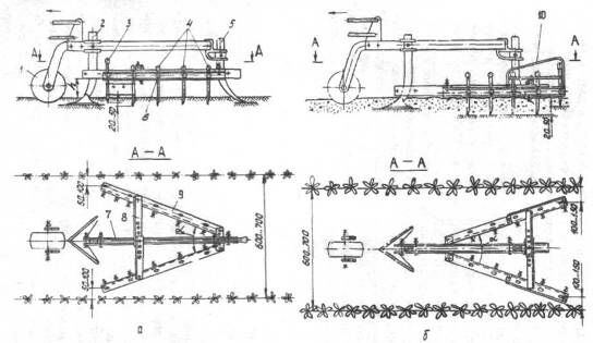 Рыхлитель (рис. 4.1) состоит из центрального бруса 8 с продольным разъёмом, правая и левая части которого соединены между собой стяжными болтами; двух боковых планок 10, выполненных из верхнего и нижнего уголков и присоединенных передней частью к проушинам центрального бруса; регулируемой по длине поперечной связи 9; восьми средних 4 и двух крайних 8 зубьев, закрепляемых на боковых планках на разной высоте с помощью фиксаторов в. При необходимости на рыхлителе могут быть установлены щитки 7 для зашиты растений и ботвоотводы 11 (рис. 4.1,б).